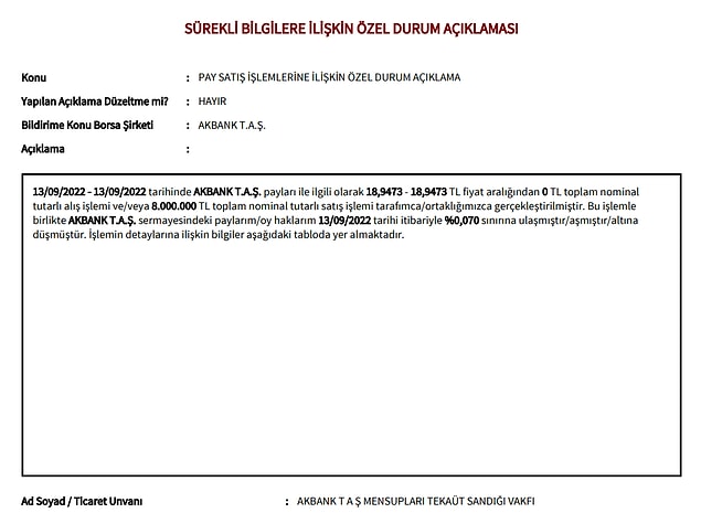 Kamuyu Aydınlatma Platformu’nda (KAP) yapılan açıklamada, Akbank T.A.Ş. Mensupları Tekaüt Sandığı Vakfı tarafınca gün sonunda (17:04) vakıf tarafınca 8 milyon adet Akbank hissesi satacağını açıklanınca piyasada da satışlar hızlandı.